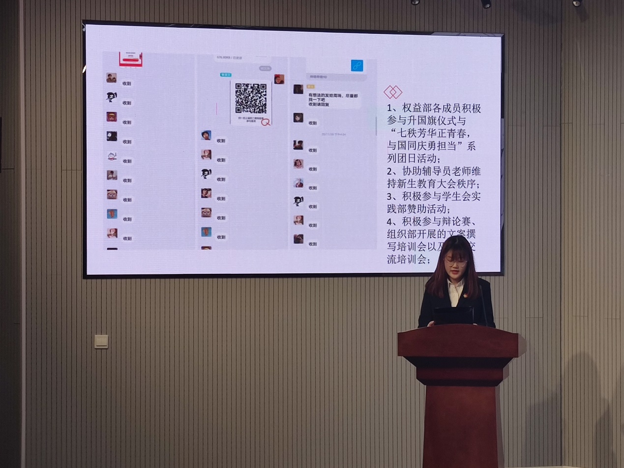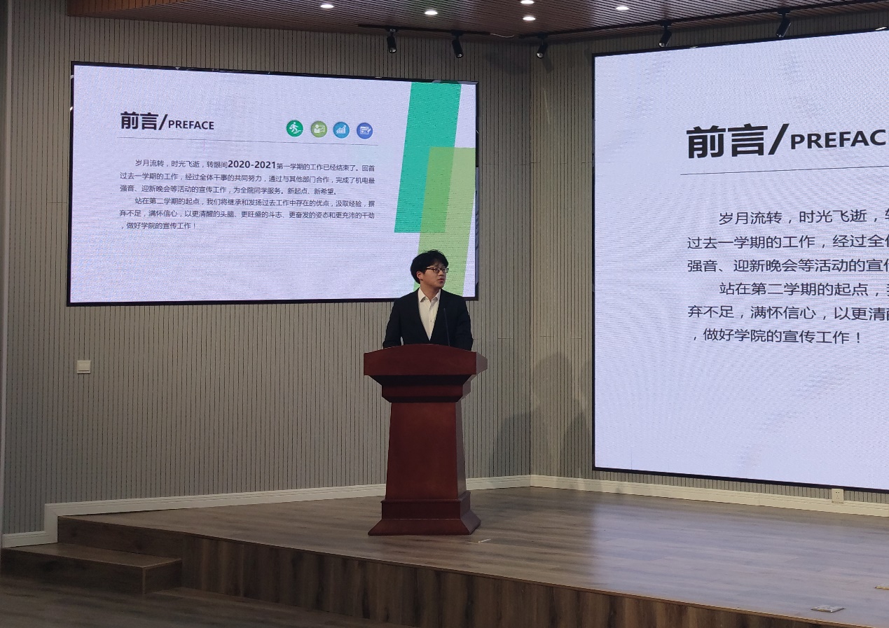 会议第二阶段,为全面落实2020-2021学年度第一学期Beat365官方网站学生会的工作开展情况,各部门针对本部的工作情况面向学生会全体同学进行述职汇报 。