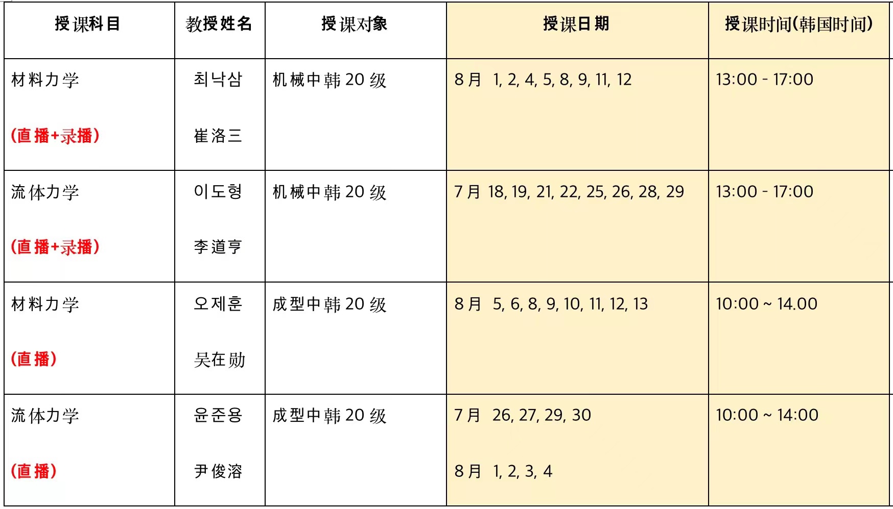 2022年暑假期间,汉阳大学7名教授对机械中韩和成型中韩两个合作办学专业级进行了共32小时的线上授课。授课科目为理论力学、工程材料与机制基础、机械制造工艺学、材料力学、流体力学等。授课方式有直播、录播、直播+录播三种。