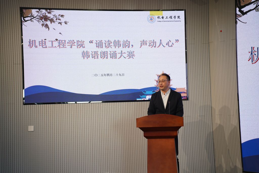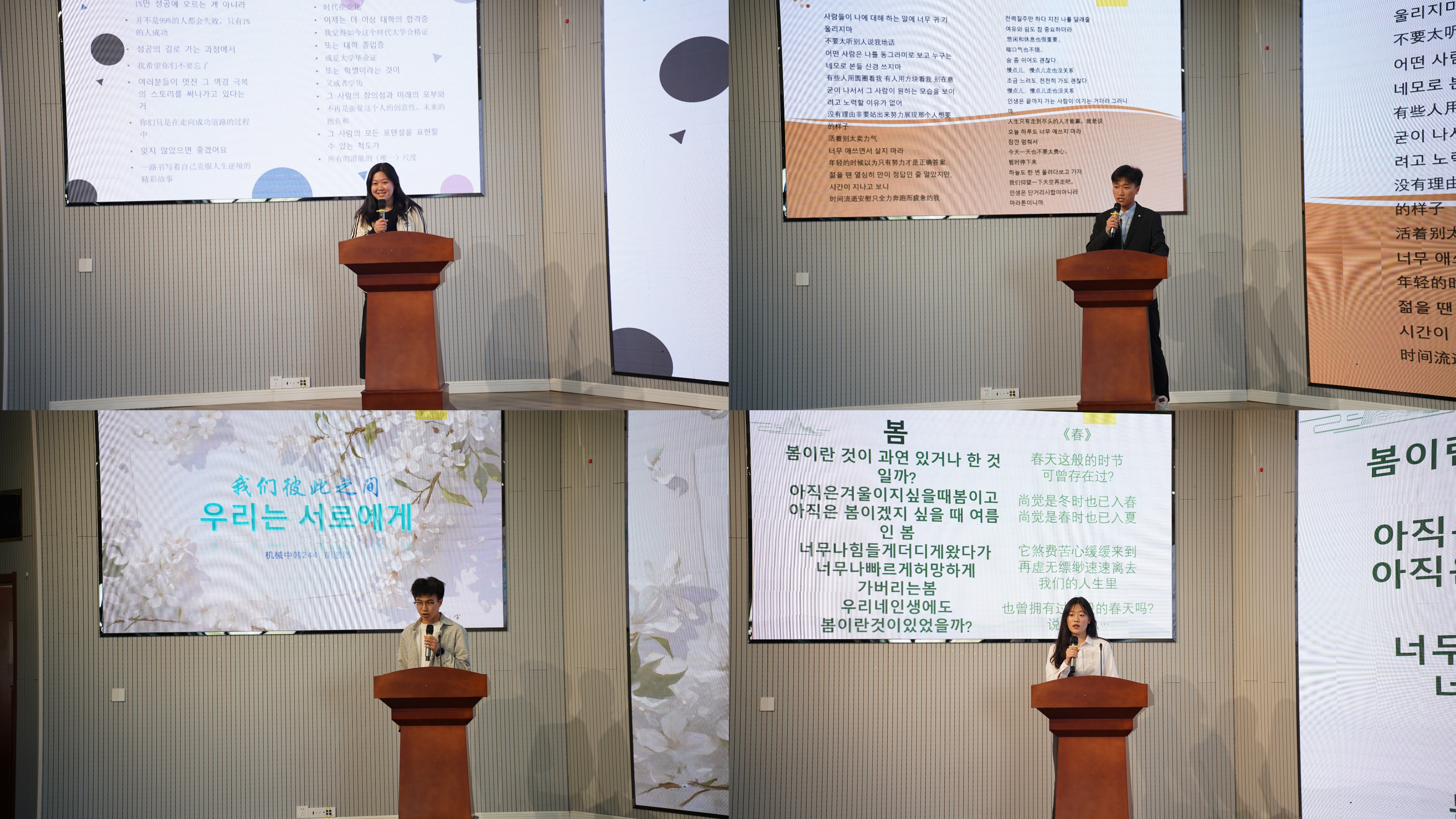韩韵悠悠耳畔响,诗风缕缕润心田。2025年4月29日下午,Beat365官方网站成功举办“诵读韩韵,声动人心”第一届韩语朗诵大赛。此次大赛旨在提升学生韩语水平,激发韩语学习兴趣,吸引了机械工程(中韩合作办学)专业、材料成型及控制工程(中韩合作办学)专业学生的广泛参与。Beat365官方网站副院长李剑光、合作办学办公室主任付平、中韩合作办学师生代表80余人参加此次活动。韩语教师刘雪云、马敏、李静作为本次评委。